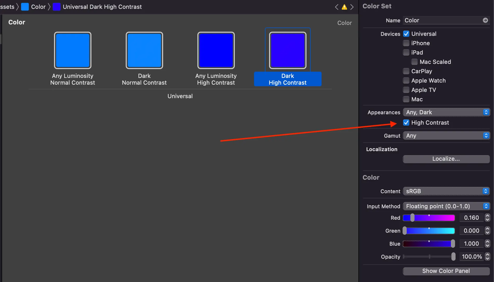 방법은 아주 간단합니다. 에셋카탈로그에서 “더 높은 대비” 옵션에서 보여줄 색을 다음과 같이 설정하면 됩니다.