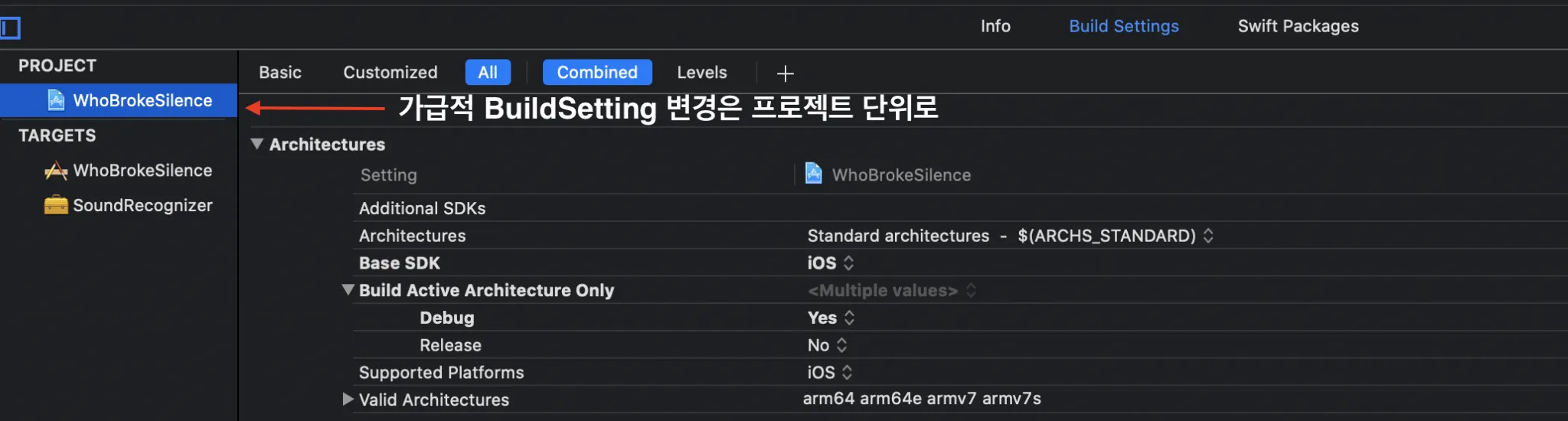따라서 Build Setting을 바꿀 때에는, 언제나 “이것이 프로젝트 전체에 걸쳐 적용되어야 하는 변경인지, 이 타겟에 대해서만 적용되어야 하는 변경인지”를 꼭 염두에 두어야 합니다.