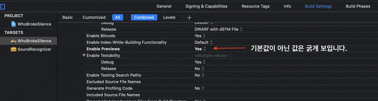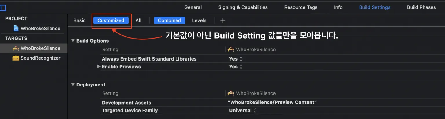 잘못된 Build Setting으로 인해 문제가 발생했다고 생각된다면, 먼저 “기본값이 아닌” 값을 쓰고 있는 Build Setting들을 살펴봐야 합니다. Xcode에서는 좌측 상단의 필터 옵션에서 “Customized”된 빌드셋팅 값들만을 모아서 볼 수 있습니다.