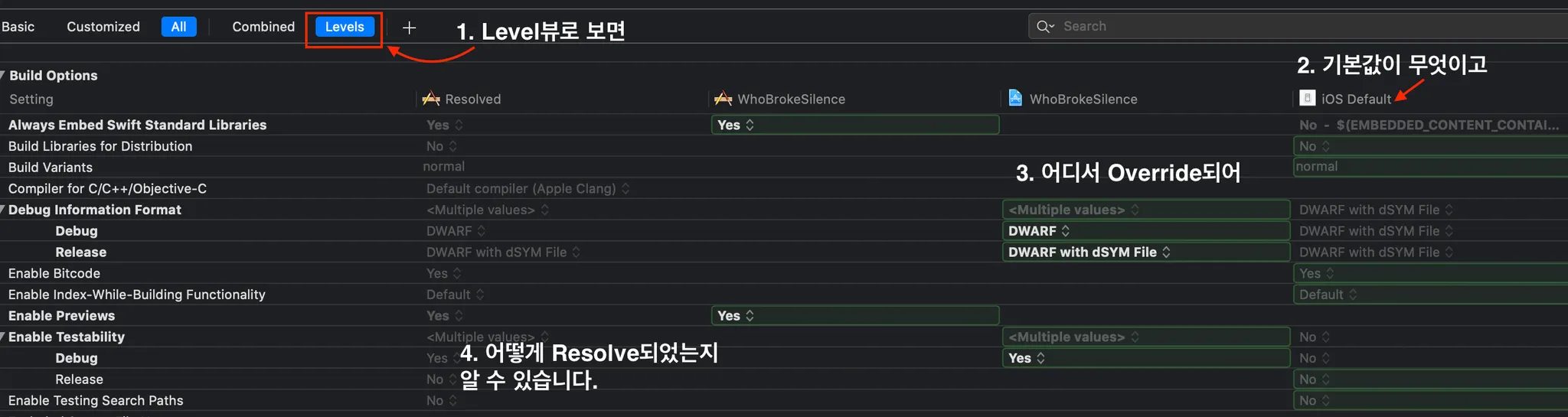 Build Setting 화면의 좌측 상단에는, “Level”이라는 옵션이 있습니다. 이 옵션으로 Build Setting을 보면, 현재 적용되어 있는 Build Setting이 어느 차원에서 정의되었는지(기본값을 쓰고 있는지, 프로젝트에 적용된 값을 쓰고 있는지, 타겟별로 override를 한 것인지, xcconfig에서 정의된 값을 쓰는지) 등을 볼 수 있습니다.