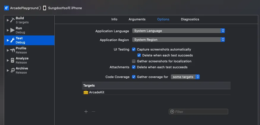 위치 및 로케일에 따라서 테스트의 결과가 달라질 수 있다는 점은 테스트 프레임워크를 만드는 대부분의 벤더가 고려하고 있는 사항입니다. Xcode에서도, Scheme->Edit Scheme->좌측의 Test 섹션으로 들어가면 각종 Options들을 확인 할 수 있습니다.