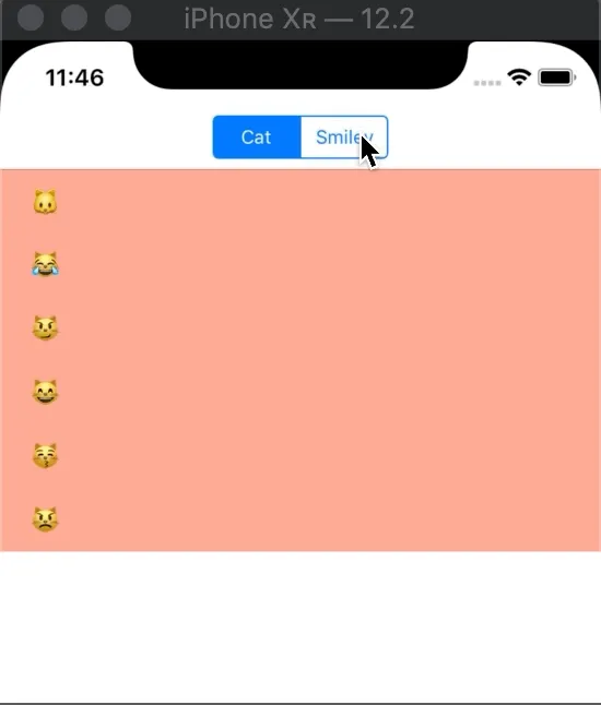 아주 잠시만 시간을 내서 아래 앱을 만들어보시겠어요? 아주 간단한 앱입니다. “Cat”세그먼트를 클릭하면 고양이 이모지 셀들이 보이고, “Smiley”세그먼트를 클릭하면 스마일리 이모지 셀들이 보이는 앱입니다. 바쁘시면 그냥 눈을 감고 상상코딩을 해보세요.
