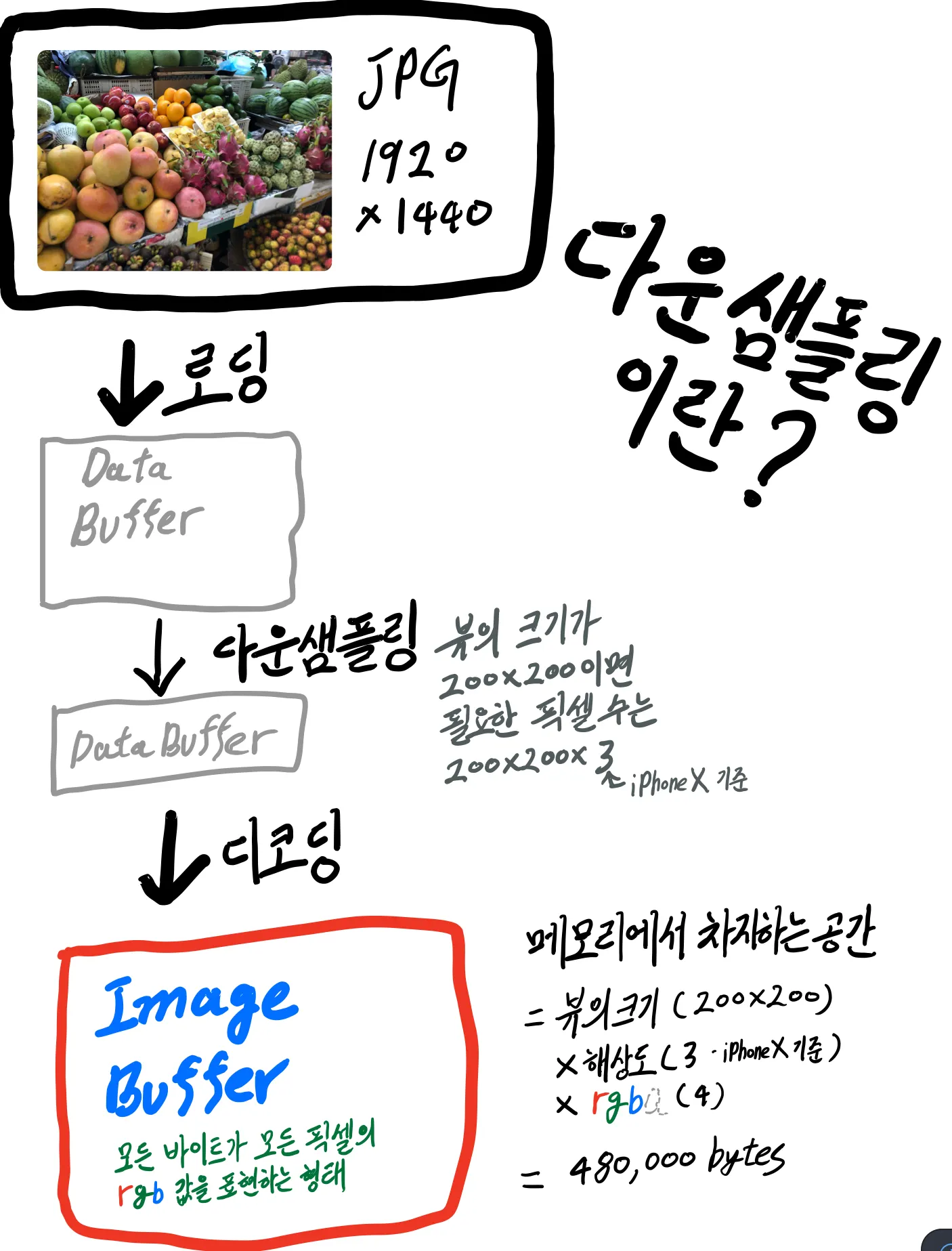 그렇기 때문에 1920×1440짜리를 표시하는 DataBuffer를 재료로, 더 저화질의 200×150짜리 이미지를 만든 다음, 이 저화질의 이미지를 decoding 해서 훨씬 적은 용량의 image buffer를 만들게 된다면, 메모리를 훨씬 절약 할 수 있게 됩니다. 이 과정을 다운 샘플링 이라고 합니다. 이상의 내용을 그림으로 정리하면 아래와 같습니다.