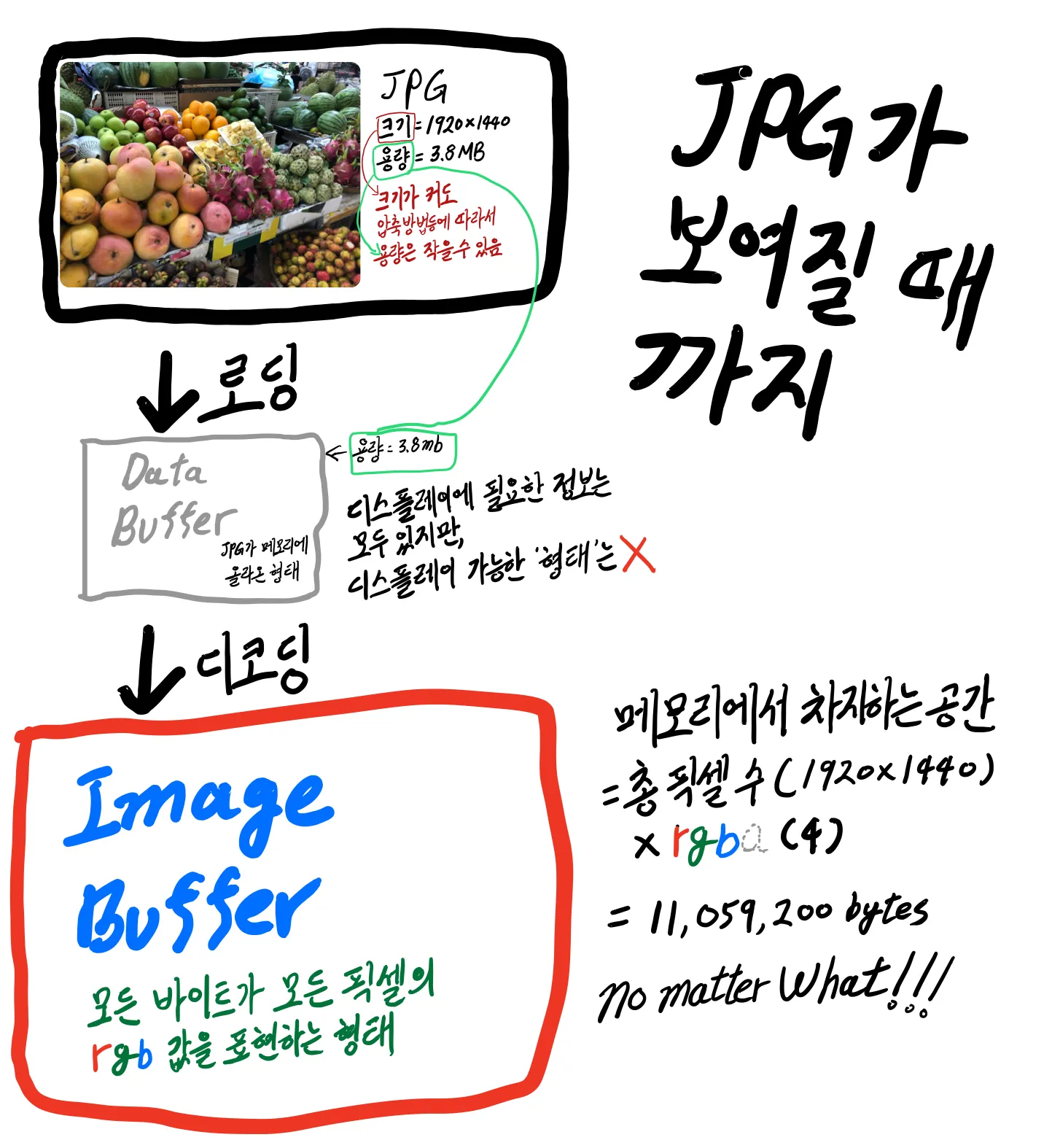이 압축을 푸는 행위를, decodinng 이라 하고, 그렇게 decoding된 형태가 바로 Image Buffer입니다. Image Buffer 형태가 되고 나서야, 운영체제는 각 픽셀 하나 하나를 어떻게 디스플레이에 표시해야 할 지를 알 수 있게 됩니다. 그리고 바로 이 시점에서 Image Buffer는, 유저의 메모리에서 10mb에 달하는 공간을 차지하게 되는 것이죠.