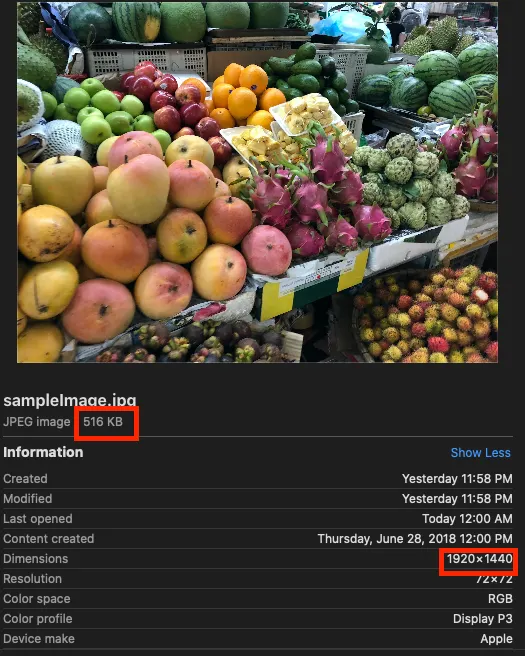 먼저 이미지가 화면에 보이게 될 때 까지의 여정을 간단하게 되짚어 보겠습니다. 최초에 이미지는 하드디스크에 저장되어 있습니다. 저장된 파일의 이름을 “sample.jpg”라고 합시다. sample.jpg의 용량은 516kb이고, 크기는 1920×1440 입니다.