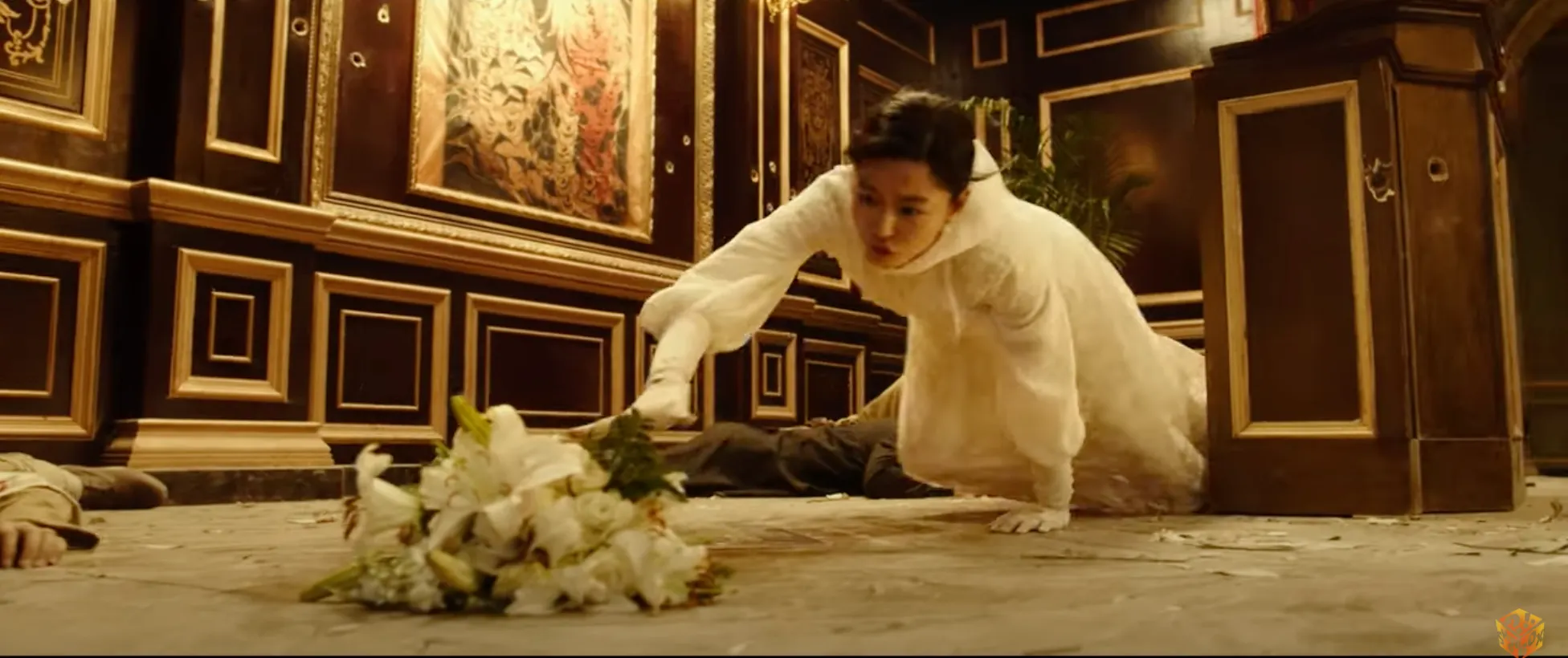 총격전이 벌어지자, 자신의 생명과 같은 무기인 총(부케)를 본인 뒤편으로 내동댕이 치는 미츠코(안옥윤). 내동댕이가 상당히 부자연스럽다.